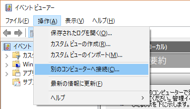 ※[別のコンピューターへ接続]メニューが表示されない場合、ツリーで「イベントビューアー(ローカル)」が選択してからメニューを開いてください。