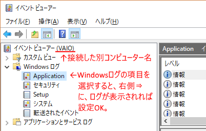 この「Windowsログ」でApplicationなどを選択したとき、右側にログが表示できるようになれば、本ツールでも接続可能となったことを意味しています。