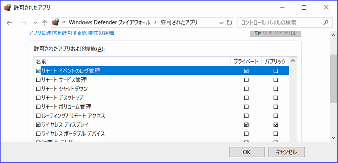 ※コントロール パネル>システムとセキュリティ>Windows Defender ファイアーウォール>Windows Defenderファイアウォールを介したアプリまたは接続を許可
