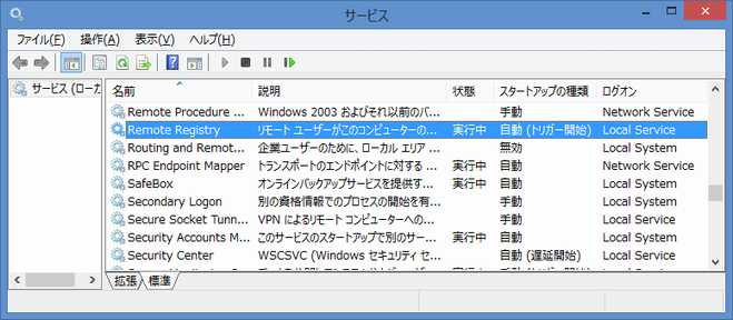 - [サービス]の一覧から"Remote Registry"を探し、[状態]列を確認。