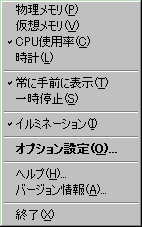 一時停止(S) … 針の表示を0にしてメモリ、CPU、時計機能を一時停止し、CPU負荷を下げます。
