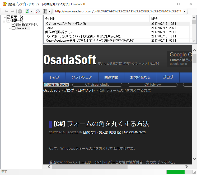 一覧の項目をクリックすると、ブラウザ領域に記事を表示します。