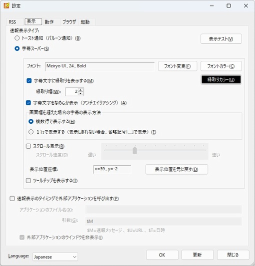 | 書式指定子 | 変換される値 | 例 | $M | 速報メッセージ | RSS News Flash Viewer Ver5.0.0リリース | $U | URL | http://www.osadasoft.com/software/rsssokuho | $T | 日時 | 2025/05/31 12:00 |